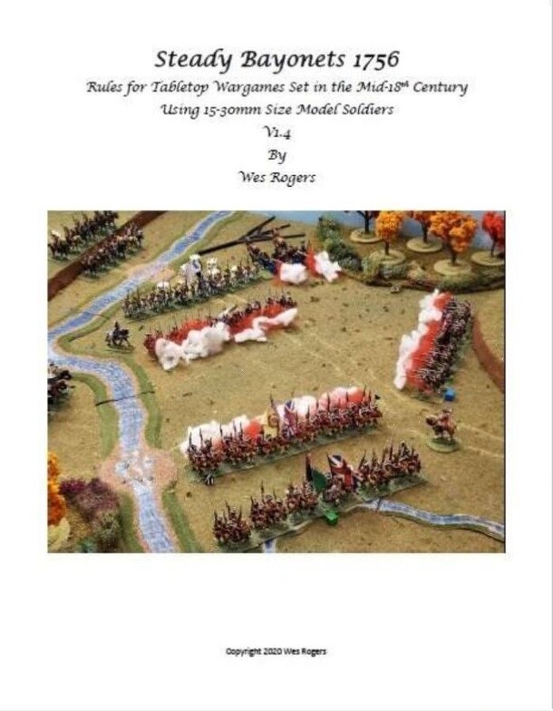 Steady Bayonets 1756 is a set of rules for playing tabletop wargames representing battles in the middle part of the 18th Century, using 15-30mm size model soldiers. The rules cover the period roughly 1740-1790 in Europe. In these rules, battles are won with lines of well-drilled, bayonet-armed infantry delivering coordinated volleys of musket fire. Cavalry...