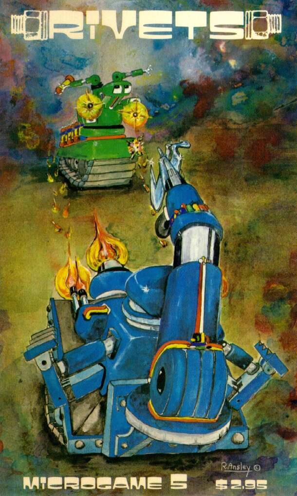 Microgame #5 in the Metagaming Microgames series. From the rulebook... "The Boppers were robotic war machines. When the war ended and everyone was dead, the Boppers kept on fighting. But what else could you expect from robots with an average intelligence of an electric can opener? Rivets is a tactical level science fiction game of robotical warfare in the...