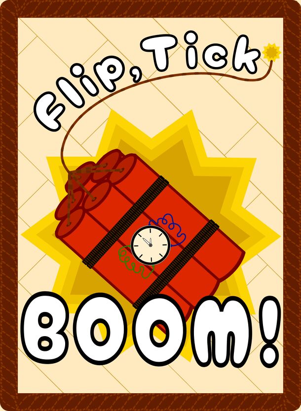 A super simple push your luck card game. Shuffle the deck and deal each player three cards. Randomly determine a starting player. On your turn you may FLIP or PASS. Flip one of your face down cards face up. If a "Boom" card is revealed your points explode and your score for the round is zero. If all three of your cards are face up you may decide to push...