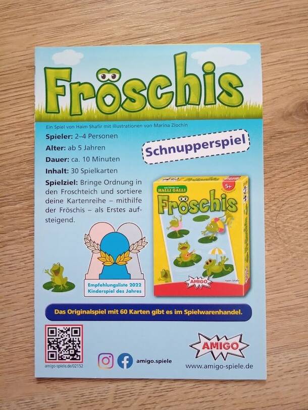 Fröschis (engl. Froggis) is the German version of the game תעשו מקום (Make Room), published in 2020 by Shafir Games in Israel. In Fröschis, you want to line up your cards in numerical order, eventually getting rid of your card row entirely. The deck consists of cards numbered 1-8 with six of each, along with four frogs and eight trash. To start the game...