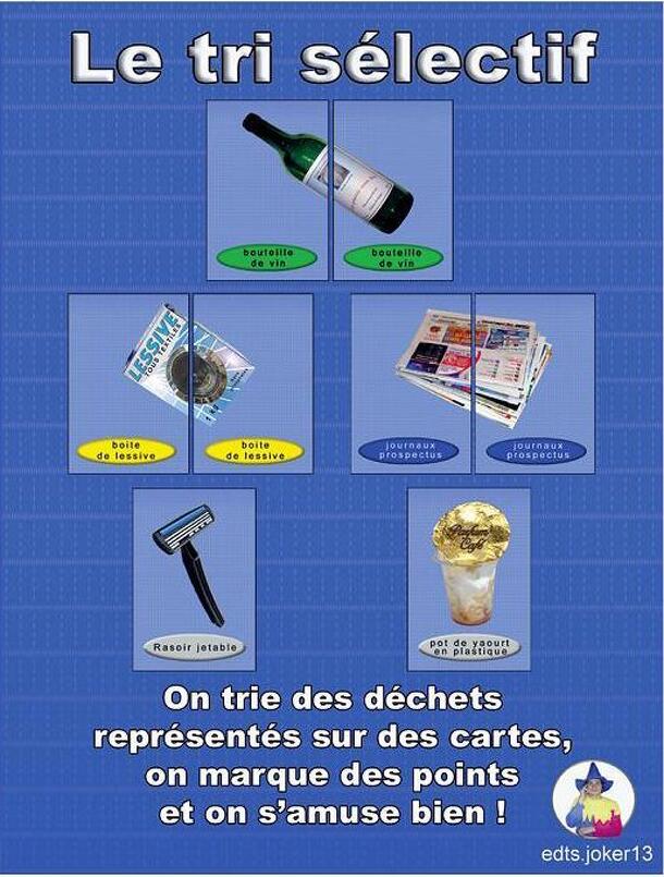 The goal of this game is to score a maximum of points by playing cards representing recyclable and non recyclable wastes. A recyclable waste is composed of two cards, and hence is worth two points. A non recyclable waste is only represented by a single card, and is therefore only worth one point. This is an educational game which aims at helping to...
