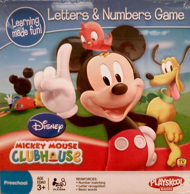 Basic childrens' game based on the Disney's Mickey Mouse Clubhouse television show. From the box: "Make a match with Mickey and friends. Have a blast with the cast of the Mickey Mouse Clubhouse Show. Match numbers on one side of the gameboard, then flip it over and see if you can match letters to spell the names of favorite characters. Will you be the Hot...