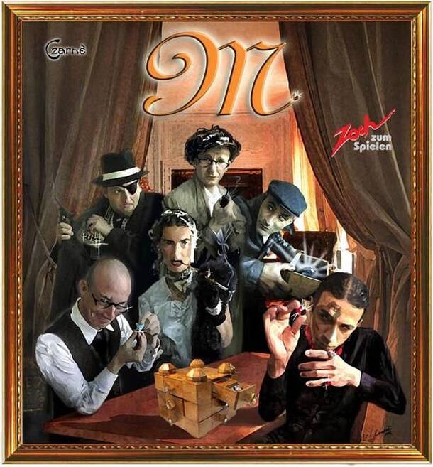 A very unusual game which comes in a beautiful wooden box. Central element is a sort of necklace case (in wood) comprising three levels, each of which has a drawer on each side. Each level can be rotated individually. The whole case looks the same on the top and the bottom so it can be turned around. Everybody chooses a role: wife, jeweler, detective, or...