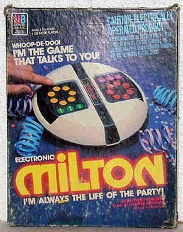 Milton is an electronic game where players try to complete phrases. It plays 3 different games but all of them have the same basic mechanics. On your turn, you press a red phrase button and listen as Milton speaks the start of a phrase like "Blink your". You then press one of the yellow answer buttons and listen to the response (in this case you're trying...