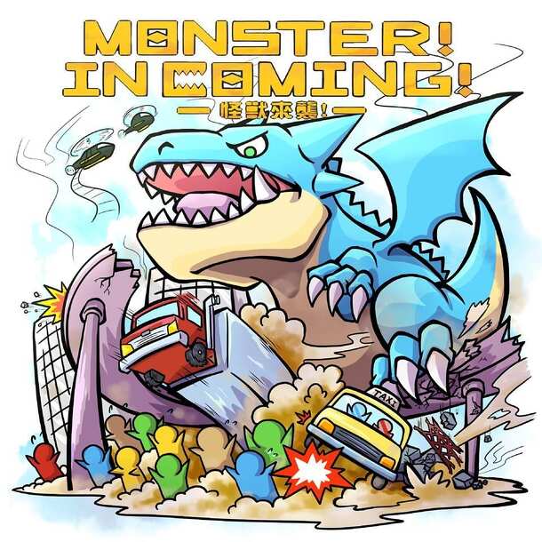 Description from the designer: Monster! Incoming! is a half-cooperative game, one in which players try to defend the city from being destroyed by a huge monster. At the same time, players also compete to earn as much fame (victory points) as possible. During the game, players use multi-functional cards for resource collecting, attacking or researching...