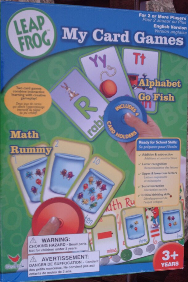 This is children’s game that contains rules and card sets for Math Rummy and Alphabet Go Fish. Also included in the box are four children’s card holders to allow young children hold a hand of cards. The Math Rummy game has 24 cards that contain number cards (1-10) and plus cards, minus cards and a board to create simple equations. The Math Rummy rules...