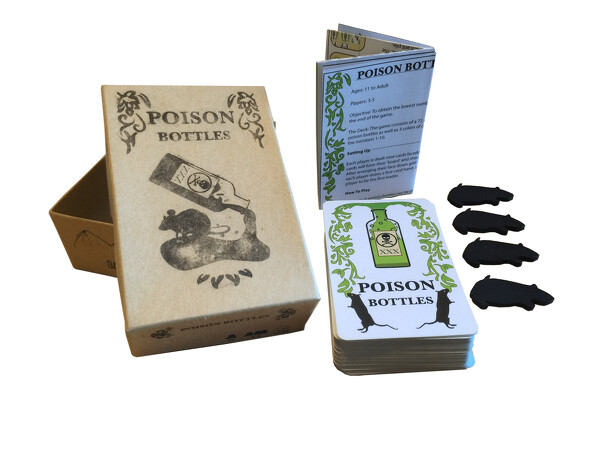 Poison Bottles is a card game with many classical elements entwined. Each player has a 3x3 grid of facedown cards in front of them, for which they will try to secretly change as the game progresses in hopes to achieve the lowest score possible. There are five distinct phases in the game, starting with trick taking, where a high card of the first played...