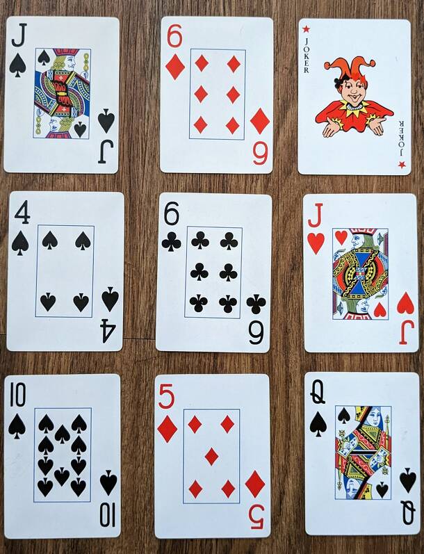 In Grid Poker, players draft cards from a series of 3x3 grids to build 3 poker hands. The first player chooses a row or column and takes those three cards. Then, the second player takes a remaining row or column, which may be only two cards. Discard the 3 or 4 remaining cards, or, with three players, give them all to the third player. Lay out a new grid...