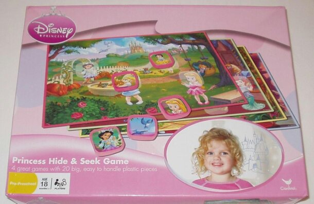 The colorful Princess Hide & Seek Game is a memory and matching game for children ages 18 months and up. It was published by Cardinal Industries with a Disney Princess theme. Children match easy-to-handle pictures in large plastic frames with magical Disney scenes on four separate game boards. One board represents a tea party in a garden, another...