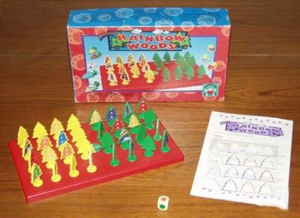 You are trying to create a path through your opponent's trees. To remove a tree, you roll a die and choose one of your opponent's trees. If it is a match, the tree gets removed. If it is not a match, the tree gets turned back around. The first person to make a path from the center of the board to the opponent's edge wins the game. A tree with a bear on it...