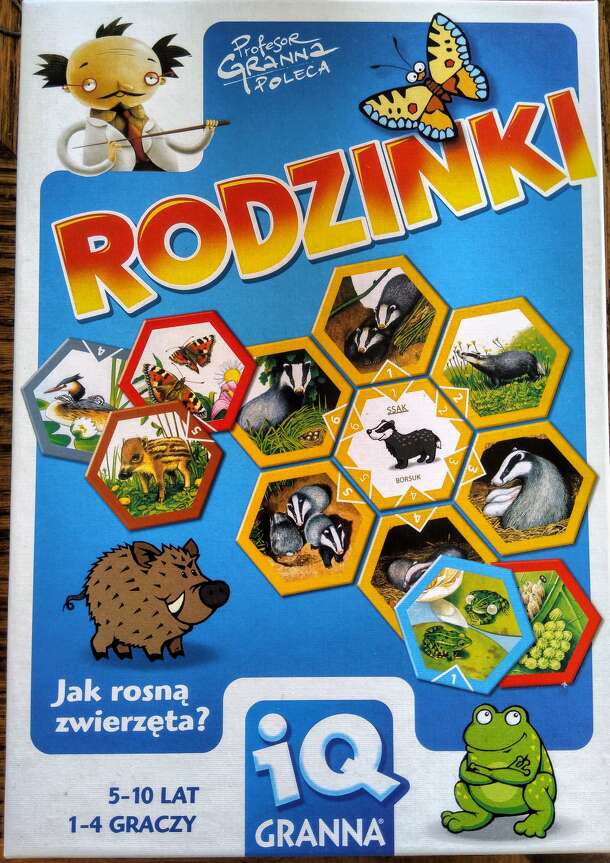 Jak rosną zwierzęta? Każde zwierzątko ma mamę i tatę. Najpierw jest dzieckiem, potem rośnie, zmienia się i samo staje się mamą albo tatą... Obrazki umieszczone w pudełku przedstawiają kolejne etapy rozwoju ośmiu gatunków zwierząt. Młodszym dzieciom proponujemy układankę, starszym – ciekawą, dynamiczną grę. Tile game with animal theme. For younger players...
