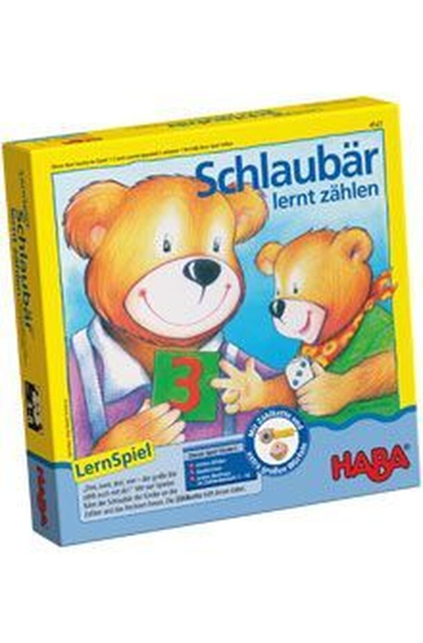 Part of the "LernSpiel" (English = Learning Game) series from Haba, this is a series of counting games for young children using a very cute counting string with wooden bear, 4 sets of 1-10 counting tiles (marked with dice faces, numbers, fingers & cubes) and three different dice (marked with numbers, dice faces & fingers). The name, btw, means "Clever Bear...