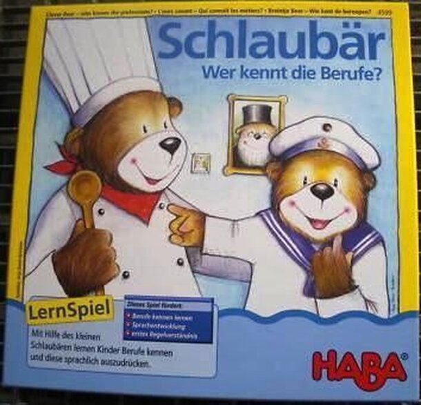 The children should try to find the halves with the same professions and name the professions correctly. The cards are turned face down, shuffled and laid out. The active player turns up two cards, if the pair matches, the child is asked to describe the profession. The “Schlaubär” allows control, if he fits into the cut-outs of the pair, the pair matches....