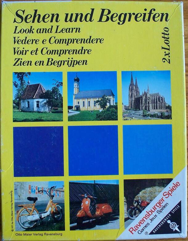 'Look and Learn' (English name) is designed to stimulate a child's ability to "discriminate between objects, to compare them, to grasp relationships between them, and to sort according to common characteristics." (From the box bottom.) Up to seven different games are possible using the multi-picture boards and picture tiles included. Three of them are...