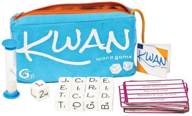 In the real-time party/word game Show Me The Kwan, players try to grab dice to match the words they shout out to match a given category – but you can't say just anything. At the start of a round, someone chooses a category from a randomly drawn card, then rolls the order die, which indicates first, second or last. Someone then rolls the letter dice, and...