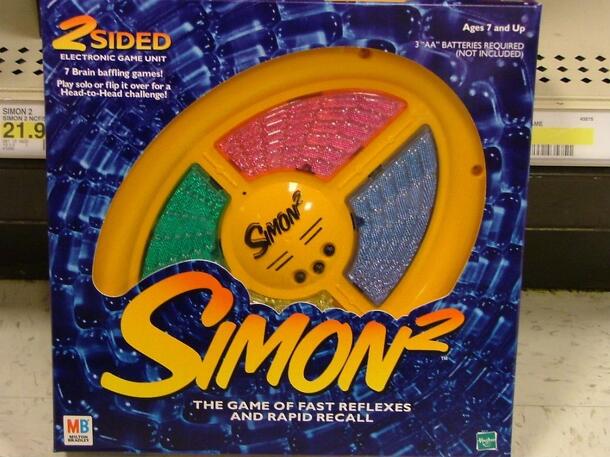 Super Simon - Play head to head, individually or as a team. Contains 5 different games, 4 skill levels and 3 speeds. Gameplay is like original Simon but has 8 colored buttons instead of 4.. Generally, players need to repeat a sequence of increasingly long sequence of button presses. The sequence starts with one button and each time the sequence is repeated...