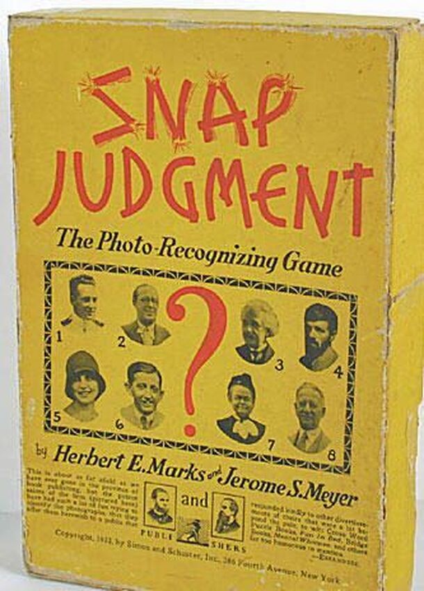 "The Photo-Recognizing Game" Intended to be a party game I suspect. Each player receives a scoresheet. A page of 12 photographs is chosen and on the word "Go", all players (or teams) write down as many of the people on that page that they recognize. The winner is the player or team with the most correct answers. The ever-hopeful publisher recommends that...