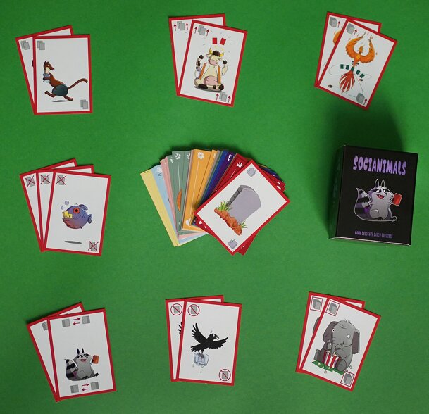 Socianimals is a card game about animals and families. The main goal of the game is to collect as many animals of the same family as you can. The more animals in the same family you collect the more points you score. Every player starts with 5 cards in its hand. Every turn a player takes a card from a covered common deck (thus reaching 6 cards in hand) and...