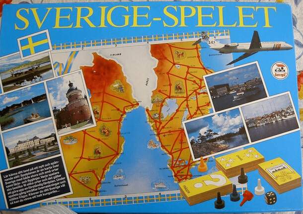 From the rules: A family game with both difficult and easy questions about swedish geography, history, culture and nature. Sverige-spelet is both exciting and educational. Start with dealing out city-cards. Then the players must travel to those cities on the cards they've been dealt. It's important to have a cunning travelplan - and also to be lucky and...