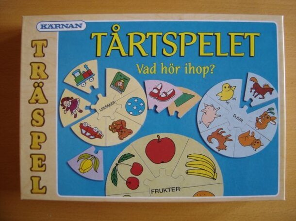 Players each start with one circular jig-saw piece that says Toys, Cloths, Flowers, Fruits, Animals or Shapes. This decides what kind of pieces each player is trying to collect. To each circular piece belongs six segment pieces, each with a picture, e.g. a pig or a horse (Animals), or a doll or a ball (Toys). These 36 segment pieces are laid out face-down....