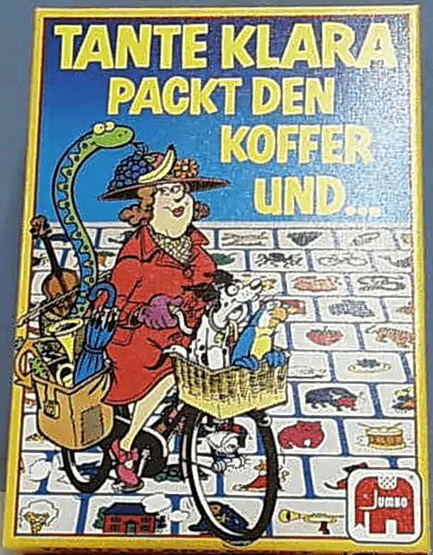 Variation of the (German?) classic game "Kofferpacken". There are 108 item cards. The starting player announces that aunt Klara packs her suitcase and takes item X (puts tile on the table). The next player puts another tile on top, announcing that aunt Klara packs item X and item Y. Continue until somebody cannot repeat the entire list of things stacked...