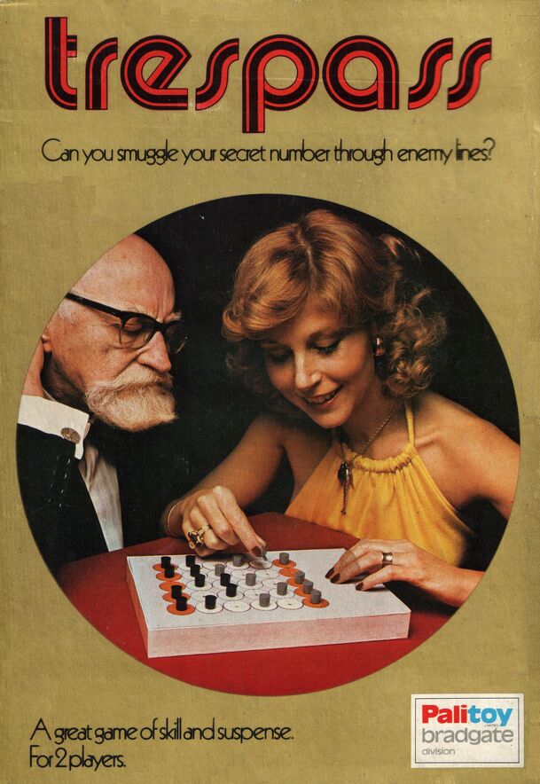 In Trespass both players set up large plastic numbers (0 through 9) on the first two rows of a 5X6 grid then each player secretly selects one of the numbers. The object of the game is simple... get your selected 'secret' number to your opponent's first row. Pieces may move, on a clear path, as many spaces that are open or make single or multiple 'jump'...
