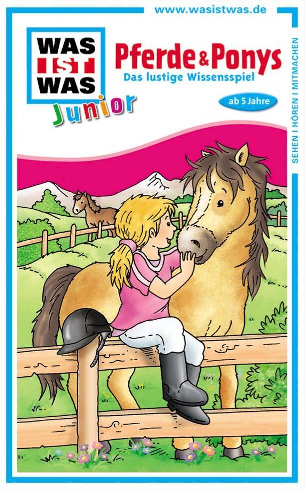 What do horses like to eat? What things do you need for horse care? What can be discovered in the paddock? In Was ist Was - Junior: Pferde & Ponys, forty cards show everything that girls want to know about horses in ten different topics. These forty cards are first revealed at the start of the game, then hidden. A player draws a topic card – say, horse...