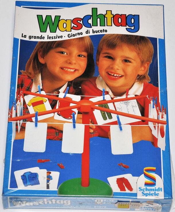 This unusual game contains cards which show clothes, two dice and a rotary clothesline on which the cards are "hung up to dry" with clothes pins. Each player gets an additional card with a child wearing four pieces of clothing and has to find them on the lines. But the cards can only be taken off the side facing the player, and he or she can only see the...