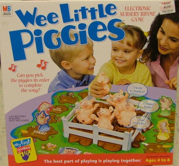This kids game has an electronic plastic pig pen with 5 pigs in it. When lifted, a pig repeats part of the "This Little Piggie" nursery rhyme - one went to market, one ate roast beef etc. To move, you try to lift pigs from the pen that say the nursery rhyme in the correct order, and you advance a number of spaces equal to the number of versus you got in...