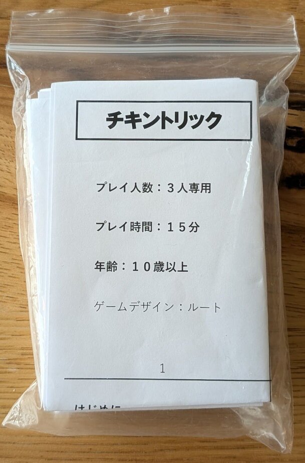 Chicken Trick is a trick-taking game for exactly 3 players. The deck in the game uses cards numbered 1 to 5, with no suits. After a traditional trick-taking phase, players perform a push your luck game with the cards they won in tricks. Simultaneously choosing to reveal more cards or stop, the cards revealed will determine each player's score. Most cards...