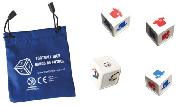 Football dice. Play soccer with 4 dice. You can throw your dice 3 times and choose wich one to get or to reroll. You need results with the color of your team, and one die with corner, penalty or goal symbol. After 3 throws, your turn is over. You must take notes fo the scorings. The player who scores most goals will be the winner. Juega al fútbol con 4...