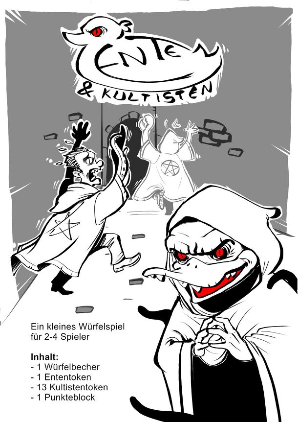 2-4 cult leaders start with a set of cultists as their flock. They need lots of luck as they roll their minions (as if they were dice) every round to see how they perform their tasks and to score points. The problem is, there is a duck amongst them and it´s either helping or killing your people, depening on it´s stance. Less cultists means less points....