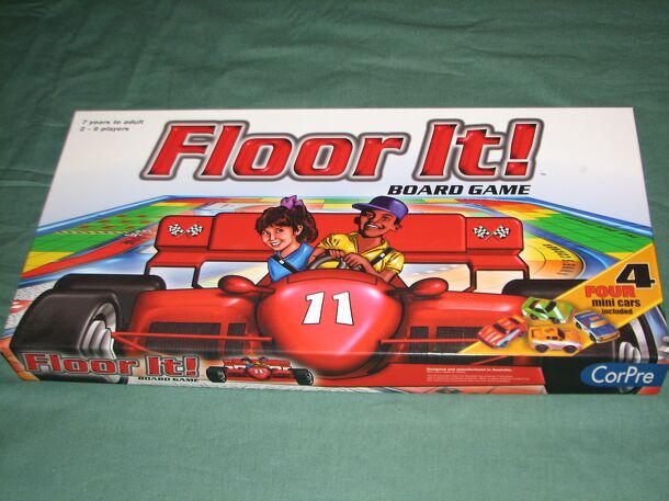 From the back of the box: Floor It! is very easy to play. Players choose the number of laps to race and then move around the track by choosing one of three card types - Floor It!, Cruise, or Take It Easy. The game is a trade-off between speed and safety. Each player must decide how they will drive in order to safely navigate the course. It is safest when...