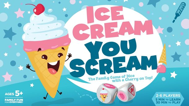 ICE CREAM YOU SCREAM! is a family game for all ages where you each own a competing ice cream shop. You roll 7 dice to dish out ice cream cones complete with whipped cream and a cherry on top. Players roll up to seven dice per turn trying to build their treat with a flavored cone, cherry, whipped cream, and 1-4 specific scoops to score points. As long as...