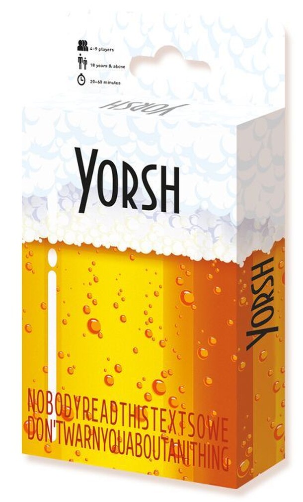 Yorsh is a liquor game helping to have a great time in a group. Inside the box there are task and bonus cards. The main principle is as follows: you either complete the task or you drink. Bonuses are for making tasks harder or easier. During the set you will have to propose toastes with difficult words, remember car brands, football players and countiers...