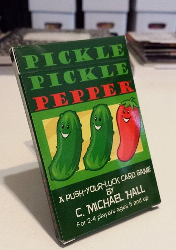 PICKLE PICKLE PEPPER is a casual push-your-luck micro-game...which is a whole bunch of industry jargon that translates to, "This simple game turns a small number of components into a ridiculous amount of fun!" Designed to be playable by almost anyone in a very short period of time (5 to 15 minutes, on average), PICKLE PICKLE PEPPER is the perfect filler...