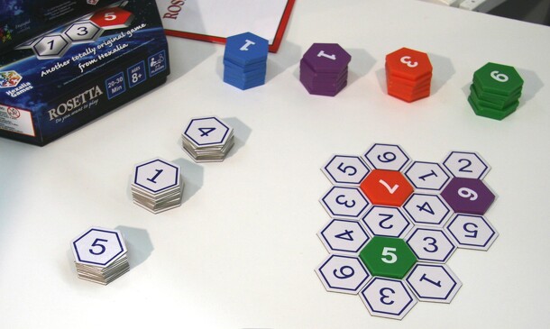 Rosetta is a boardless tile-laying game with hex-tiles. Each tile (except 3 extra-tiles showing a rose) shows one of the numbers from 1 to 7. They are available in four player colours and 7 times as white. The white ones are the general supply, forming three stacks, so the three top tiles are available. Each player has the tiles of his own colour as a...