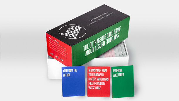 It’s now a family game with a built in raunchy expansion for adults. You get to draw a scenario, while others respond and generate laughs. 4 decks. 3 of them are used together to form a complete sentence creating just 1 of one million possible scenarios. The 4th deck is used for responses. One player will read the scenario while the other players respond....