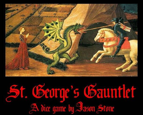 St. George's Gauntlet is a "push your luck" dice game. As a knight of the Order of St. George, you must collect gems from a cavern guarded by a gauntlet of dragons. The roll of the dice determines whether you collect gems or get killed by the dragons. Certain rolls will allow you to kill the dragons, if you are willing to take the risk of rolling a special...