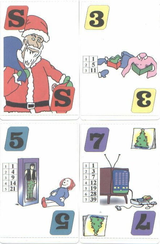A rummy-like game with an element of "push your luck" and a Christmas theme. Players start with a card-drawing phase in which they try to draw as many cards as possible without drawing a duplicate. A player can stop and keep the cards at any time, but if a duplicate appears, the cards must be given out as gifts. After drawing cards, the player must lay...