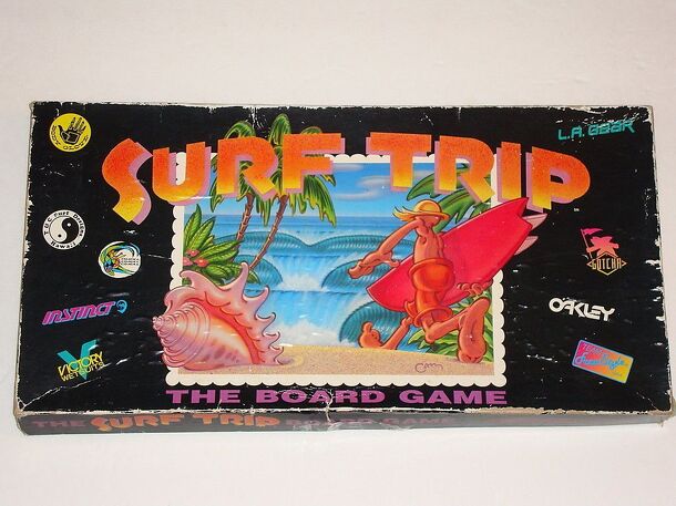 Four surfers travel the world to see who can be the first to get $500 and 3 sponsors. Players roll to move around the board, each space giving or taking cash or movement bonuses. Some spaces are surf contests which allow all surfs to surf against each other to win cash prizes and sponsors. Surfers flip cards which are their moves that provide points. A...