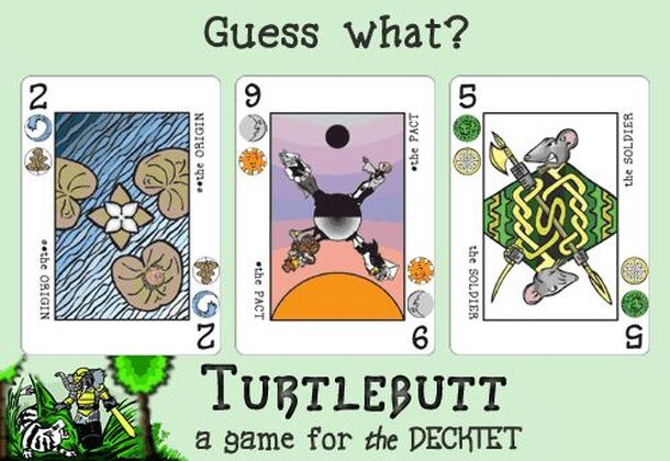Terrapin is a family of Decktet betting games based in which you try to avoid getting every suit. It has been described by some players as Blackjack meets Texas Hold 'em - you want to get a better hand, but every card you add increases the chance you'll get Turtle Butt. An earlier version of Terrapin was known simply as Turtle Butt. That's still the name...