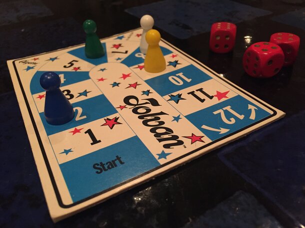 This is a minigame where you take turns to roll three dice and hopefully add up the numbers in ways that allow you to advance your pawn on a track from 1 to 12 and back again. You may keep rolling as long as you manage to advance, but if you then get a useless roll you go back to where you were. Apparently if you subtract the press-your-luck element you...