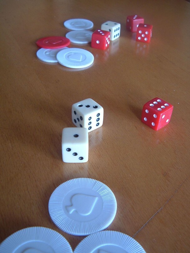 Bogart is a quick push-your-luck dice game. Each turn, the acting player places one chip from the bank into the pot and rolls one die. If the roll is a one (the player 'aces out'), the turn is over. Otherwise, the player take the pot. Alternatively, the player may add two chips to the pot and roll two dice. If either roll is an ace, the turn is over. This...