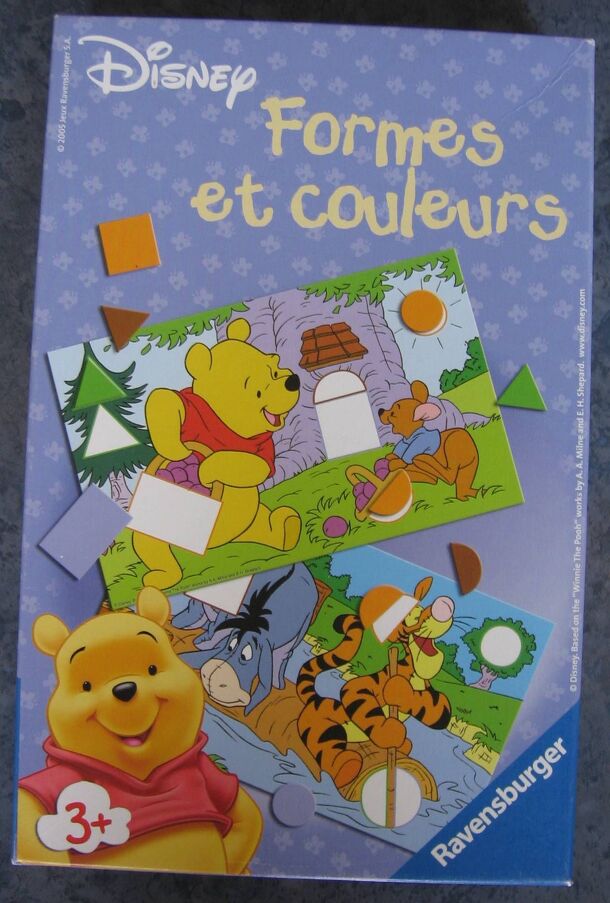 Formes et couleurs (french title) is a Winnie The Pooh themed game for children 3 and up. Each player takes a board with a drawn scene and tries to fill the colored shapes on it. To do so they roll one shape-die (and one color-die if they are older) and are allowed to place a piece of the matching shape (and color with the advanced rules). If they have no...
