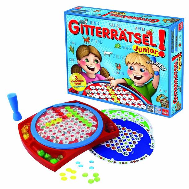 Gitterrätsel! Junior is the kid's version of Gitterrätsel!. Rotating the game board reveals a sequence of images, a word or an image in an open field of the board edge is visible. Whoever first discovers the corect sequence of pictures and letters on the board is the winner. Opponents compete to discover the hidden word first corresponding to the picture...