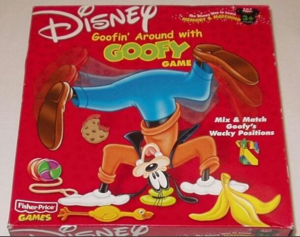 This memory game also teaches young children about colors and patterns. Goofy is a cardboard cutout in front of a color wheel. He is standing on his head and the contents of his pockets (the memory cards) have fallen onto the table. A player draws a "pose" card and tries to move Goofy's legs to the correct colors and position. If correct, the player may...