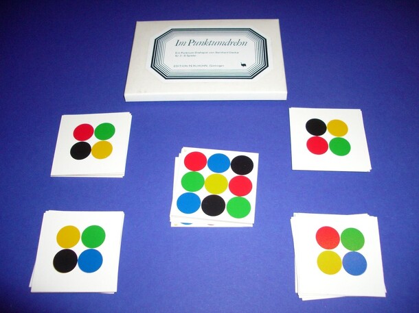 Nine colored dots are on a card in the middle of the table. Each player has a number of cards with four colored dots in front of him/her. The goal is to find a dot combination of one of them in the nine dots in the middle. When this is achieved, the successful player turns over the card and places it in the middle - there are nine dots on the backside, so...