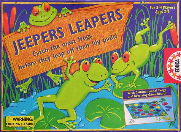 Jeepers Leapers is a children's game suitable for Ages 3 - 6. "Catch the most frogs before they leap off their lily pads!" Foam frogs are placed randomly in the holes on a rotating board (the lily pads). A pair of dice with coloured sides are rolled and all the players dive to grab frogs that match the colours on the dice. For example, if the colours red...