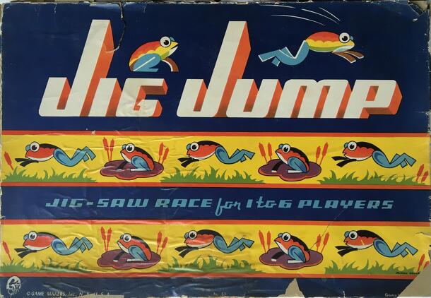 This c. 1940s game has an unusual mechanism: competitive jig-saw! The game consists of six similar jig-saw puzzles. The images are the same, but the piece shapes for each puzzle are different. Each of the 36-piece puzzles has a row of frogs, alternately jumping and sitting on lily pads. When completed, they measure 23.5" long by 2.5" wide. As soon as the...